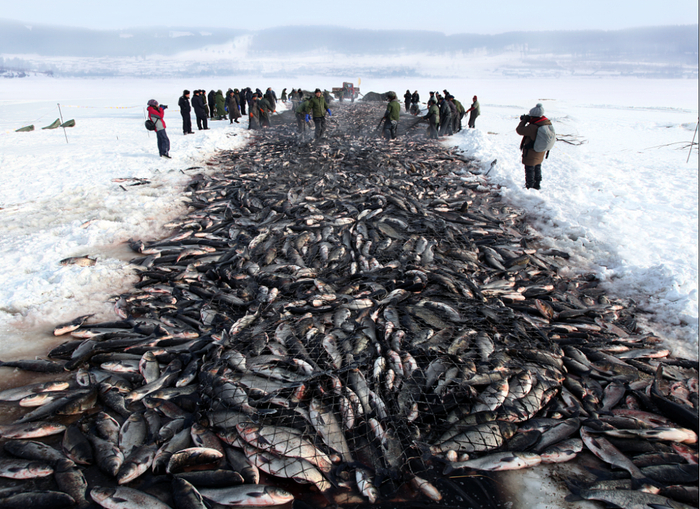 在渔夫们高亢的号子声中,800多米长的大网从冰洞中渐渐滑出,胖头鱼、鲫鱼、鲤鱼等翻滚着、跳跃着,冒着热气蹦到冰面,“万尾鲜鱼出玉门”的奇观景象让人感叹不已。