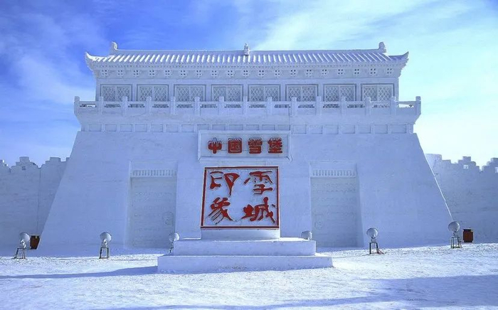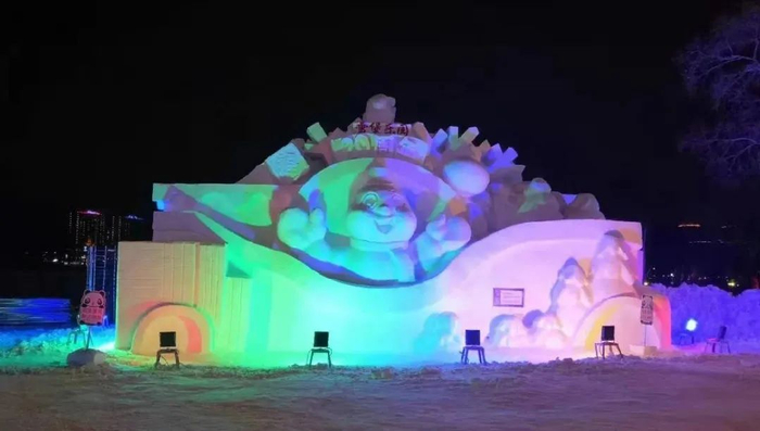 夜晚的雪堡彩灯辉映、流光溢彩,使游客置身其中如梦幻世界。