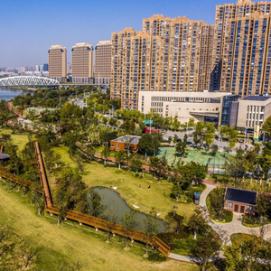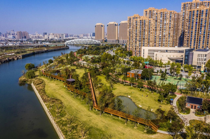 航拍瑶海区南淝河初期雨水治理下沉式绿地工程。
