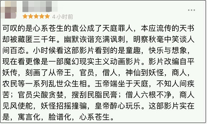 豆瓣上,有一条对《天书奇谭》的影评,概括得颇为全面:玉帝端坐天庭,不知人间疾苦;官员尖酸贪婪,搜刮民脂民膏;僧人六根不净,商人见风使舵,妖怪招摇撞骗,皇帝醉心玩乐……