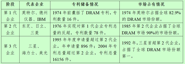 第一阶段:美企主导。1974年以前,全球DRAM专利均掌握在以英特尔、德州仪器和IBM为代表的美国企业(合称第1代企业)手中,英特尔在1974年占据了全球82.9%的市场份额。第二阶段:日企主导。1976年,以东芝、日立、三菱为龙头的日本企业(合称第2代企业)从专利总量上形成了对第1代企业的反超;后续经过长达十年的专利储备积累,1985年在市场占有率上首次超过第1代企业,拿下全球80%以上的市场份额。第三阶段:美韩主导。上世纪90年代,以三星、海力士和美光为代表的美韩企业(合称第3代企业)结束了第2代企业专利储备遥遥领先的局面(1995年专利年申请量实现超越,2004年专利申请总量实现超越);1992年三星首超第2代企业,DRAM专利全球市场占有率名列第一。