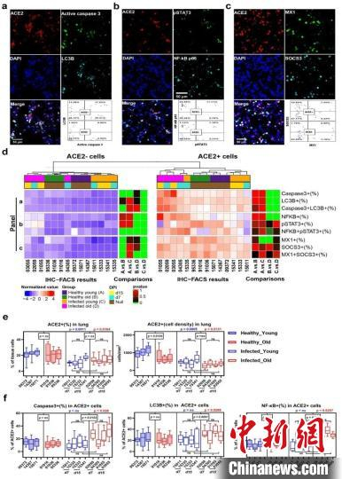 通过对感染早期未病变肺组织进行分析,该研究团队发现病毒感染并未显著受到年龄影响,老年猴与年轻猴的肺组织ACE2+细胞在感染后都大量减少。但是老年猕猴ACE2+细胞的凋亡、自噬和NF-κB活化水平比年轻猕猴更为严重。