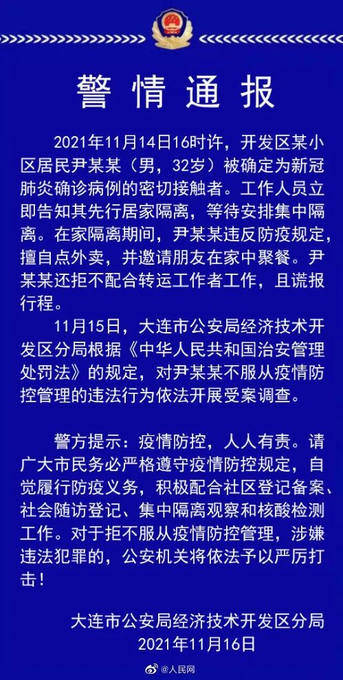 11月14日,大连一居民尹某某(男,32岁)被确定为新冠肺炎确诊病例的密切接触者。在家隔离期间,尹某某违反防疫规定,擅自点外卖,并邀请朋友在家中聚餐。15日,大连市公安局经济技术开发区分局对尹某某不服从疫情防控管理的违法行为开展受案调查。(大连开发区公安)