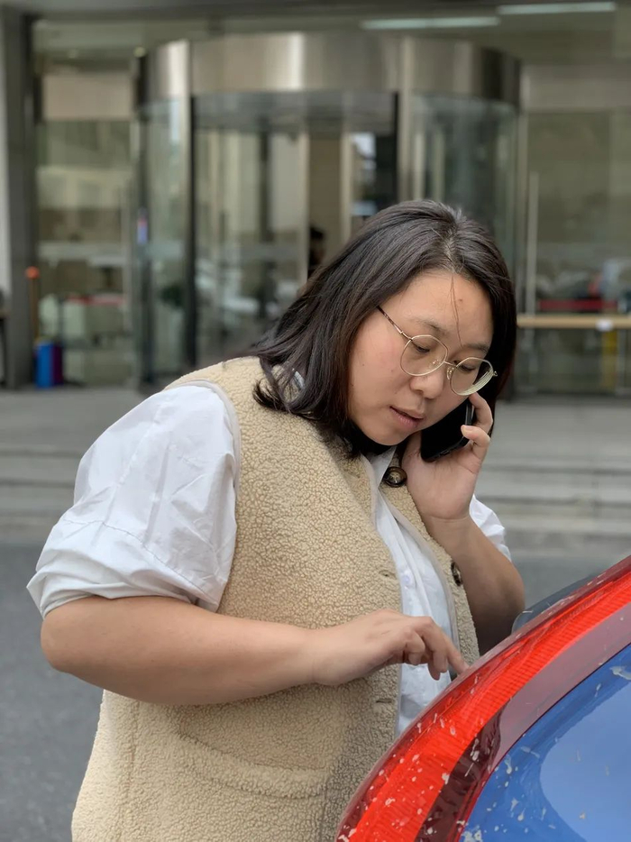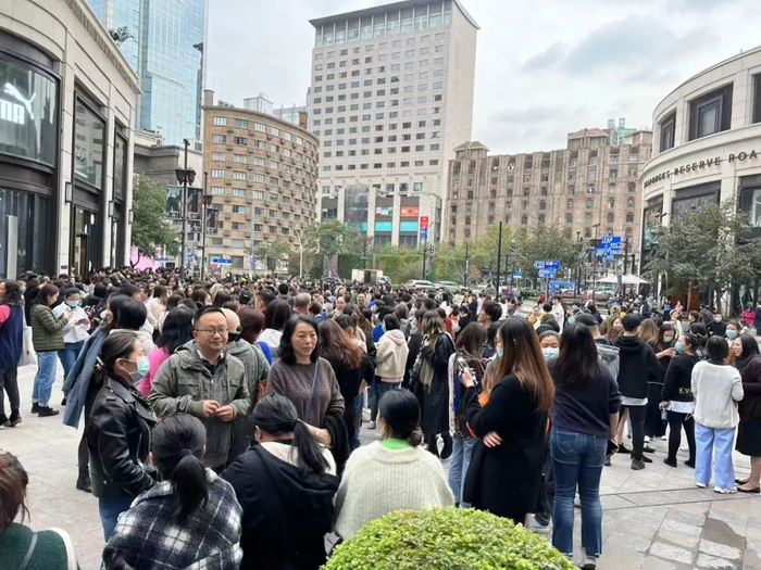2021年11月17日,上海延安中路附近办公楼,白领聚集在室外。