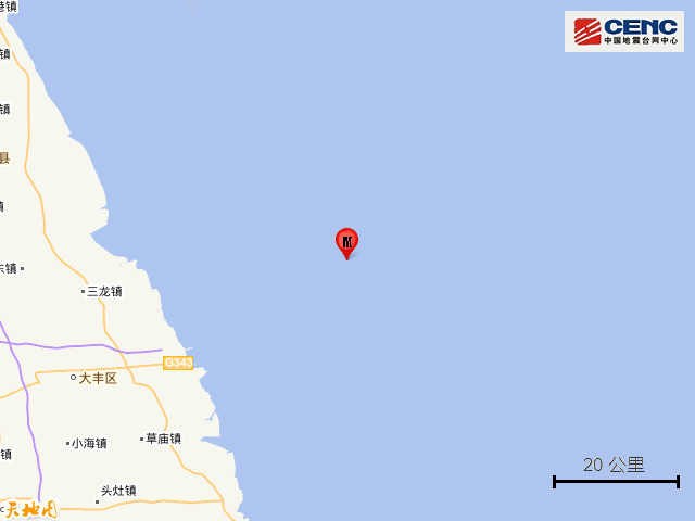 据中国地震台网正式测定,11月17日13时54分在江苏盐城市大丰区海域发生5.0级地震,震源深度17千米,震中位于北纬33.50度,东经121.19度,距海岸线最近约45公里。