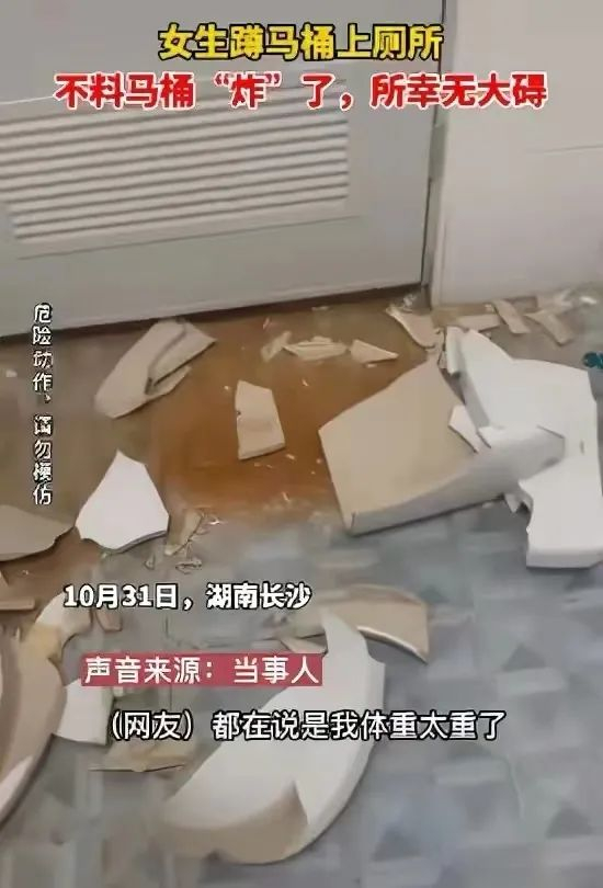 10月31日,湖南长沙。一个女生来到公共厕所,像往常一样,双脚蹲在马桶圈上。结果,马桶突然“炸”了,所幸没有崩到她。