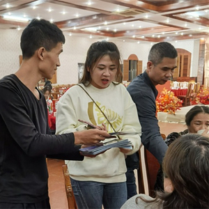 在酒店的迎亲门口,摆放着两张海报,海报上写着注册国家反诈中心APP流程及下载的二维码,同时在每张餐桌上都放置着一本反诈宣传手册。赖秋玲和叶子峰在与亲朋好友寒暄时,也不忘介绍反诈宣传海报的内容,同时引导大家注册国家反诈中心APP。