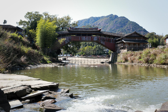 文兴桥始建于清咸丰七年(1857年),民国十九年(1930年)重修。这座一边高一边低的廊桥,雄伟地横跨于玉溪之上,全桥长40.2米,宽5米,单孔净跨29.6米,距水面11.5米,是一座叠梁式木拱廊桥。玉溪上游河面开阔,山影重叠,近处水流潺潺。廊桥所连接的古驿道,有一条长长的陡坡,全为石头铺就。这条小路相当于如今的“省道”,由于通行的任务已由一条横跨山间的高速路所取代,日益变得宁静寂寞。