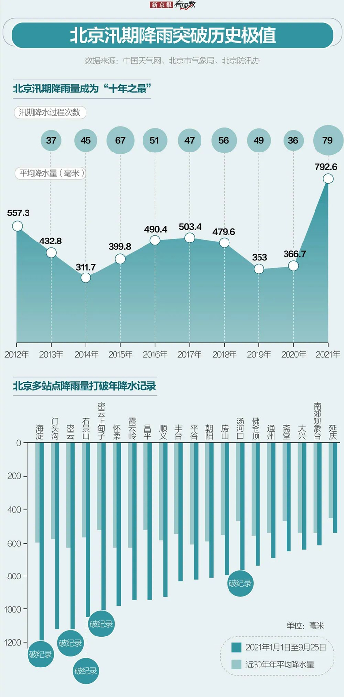 北京市防汛办数据显示,入汛以来79场降雨中,平均雨量达大雨及以上量级的10场,包括2场暴雨,全市平均降雨量792.6毫米,较常年同期425.7毫米和近十年同期数据,分别偏多了约九成和七成。