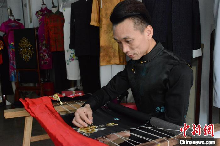 “绣郎”戴军正在绣制牡丹花图案的旗袍。 吕妍 摄