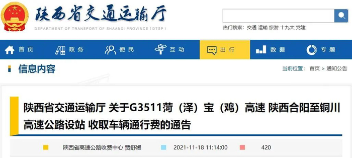 由中铁建陕西高速公路有限公司负责建设的G3511菏(泽)宝(鸡)高速陕西合阳至铜川高速公路(以下简称合铜高速)已建成。根据《公路法》《收费公路管理条例》和国家及我省有关规定,经省政府批准,合铜高速合阳东互通至林皋段已于2020年12月28日通车并设站收费,林皋互通至演池互通段于2021年11月18日正式通车,同时设站收费,现就有关事项通告如下: