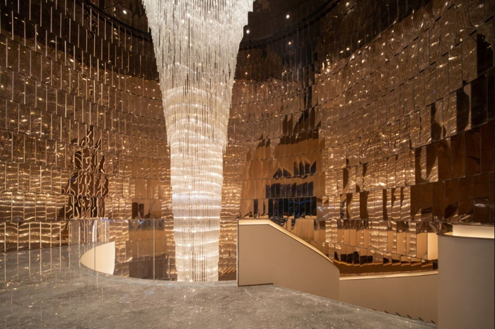 项目主入口处的白玉兰迎宾幕墙,由数万块龙鳞饰片组成,随观看角度变化其纹理可发生改变。如此气韵轩昂的唯美效果,是依靠人工将每片龙鳞以不同角度安装延展出来的。
