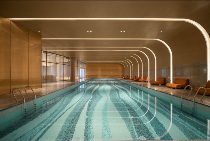 会所负一楼除了呈现视听盛宴的沉浸式环幕厅,还设置了标准泳道度假式恒温泳池,以及私人健身房、瑜伽室、会客厅、私宴厅、酒窖等空间,每一处均对标世界顶豪会所,足以成为供后来者参考的品质天花板。