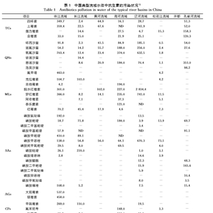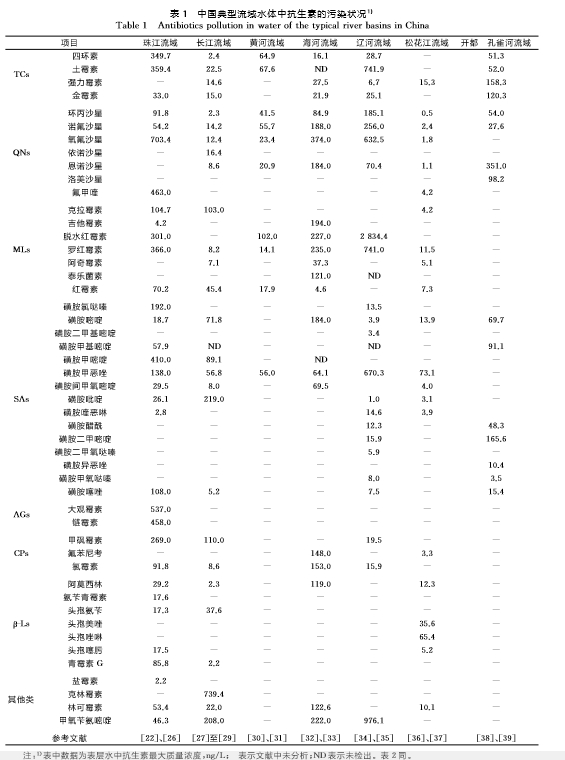 在水体中含量较高的抗生素中,喹诺酮类(QNS)抗生素中质量浓度最高的是诺氟沙星,为5770ng/g,环丙沙星为1290ng/g,四环素类抗生素(TCs)是中国水产和畜牧养殖业中应用最广泛的兽药和饲料添加剂,该类抗生素在中国典型流域水体中质量浓度最高的是土霉素,高达741.9ng/L。
