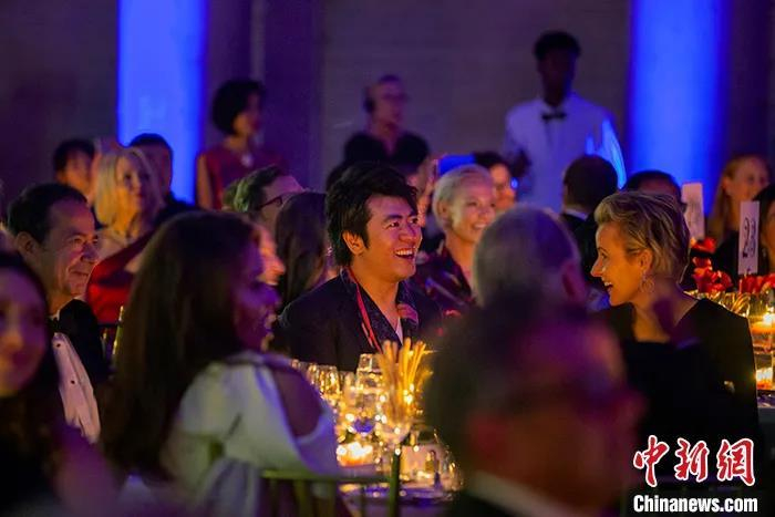 2018年10月10日,郎朗国际音乐基金会在纽约曼哈顿举办十周年庆典暨慈善晚宴,郎朗与参加慈善晚宴的嘉宾在席间。中新社记者 廖攀 摄