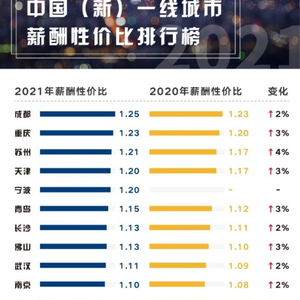 原标题:中智2021年城市薪酬性价比榜单出炉 成渝等城市更幸福