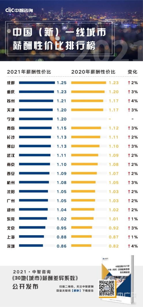 中智2021年城市薪酬性价比榜单出炉 成渝等城市更幸福