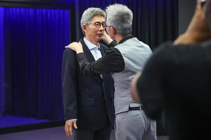 你可以看到光头部的零件就有300个,眼球的混沌程度、舌头上纹理的复制,以及通过无线信号传输,可以控制仿真人的面部表情,仿真的过程令人鸡皮疙瘩直冒。最终,当蒋昌建面对“自己”时,情绪有些复杂。