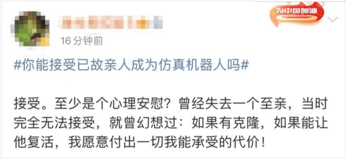 该话题发酵之后,也在热搜登顶。有网友表示支持反对意见,“机器人无法模仿人的内心。纵使它再智能,也回不到记忆中那个夏天,和父亲坐在沙发上打魂斗罗……放下执念,就是放下痛苦,也应该为他们高兴,终于不再有苦难和疾病。带着那些想念和爱,继续出发吧。”