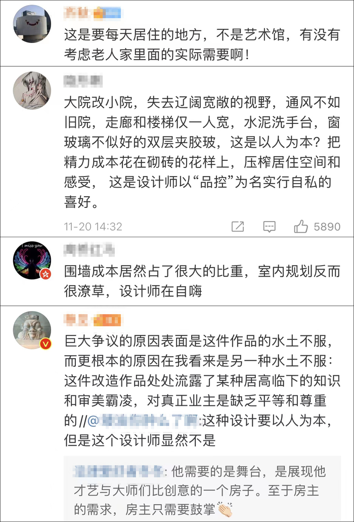 有人认为老人只是想要一个舒适一些、现代化一点的房子,而建筑师却没有考虑实际,只是在满足自己的设计理念,为自己的设计理念服务,“建筑师在炫技,你可以造一个艺术品,但对于住户来说,却不是实用的。”