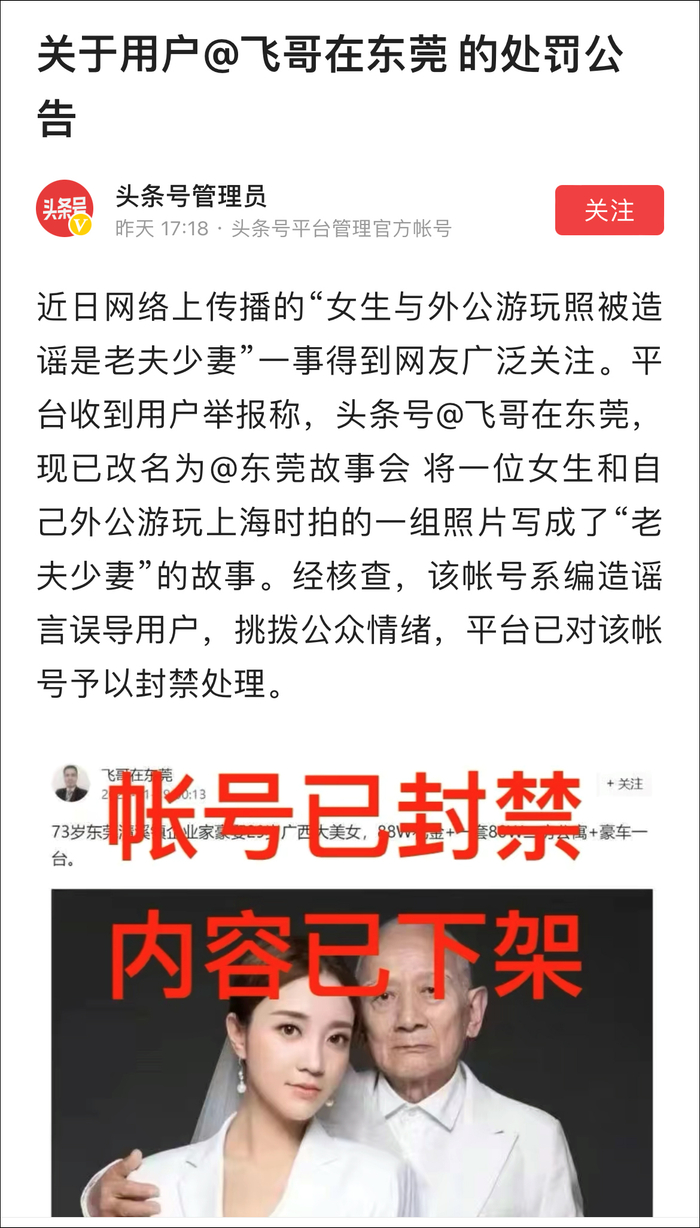 (观察者网讯)用一张女孩与外公的合影编造了一出“73岁企业家娶29岁姑娘,88万礼金、一套房一辆豪车”的故事后,昨天下午,自媒体博主@飞哥在东莞 的账号被封。