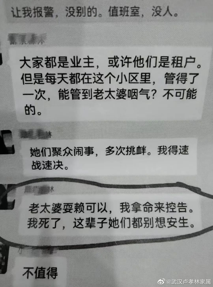 11月12日中午,卢某林在小区业主群发了很多言论,主要针对最近老太太长期围堵殴打谩骂,她向物业和网格群等持续反映情况很长时间,没有得到解决。期间有老太太的家人在小区各个群里寻找并谩骂她,也有“好事者”把老太太的家属拉到卢孝林发消息的业主群内指责攻击她。