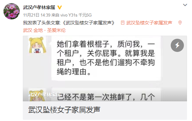 11月21日,微博名“武汉卢孝林家属”的账号发布文章:《武汉坠楼女子家属发声》,该账户微博认证为“武汉卢某林家属卢先生”。