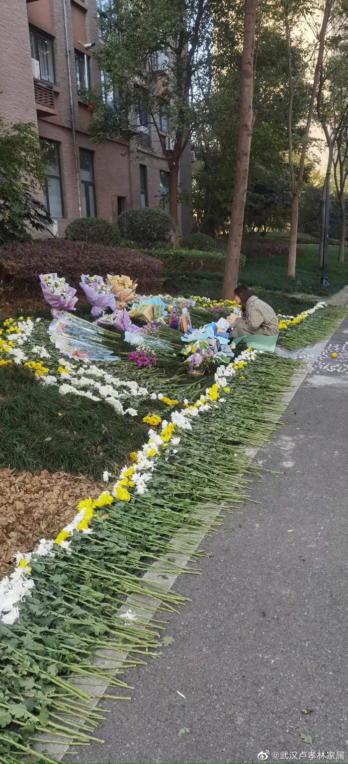 11月19日,卢某林坠楼第七天,小区上百名业主自发在草地上铺满鲜花悼念,但卢某林轻生的原因一直未盖棺定论。