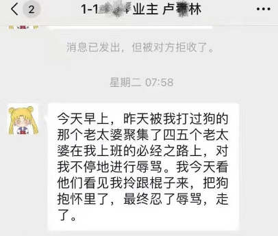 对于卢某林的事,小西说她和小区业主们都感到非常遗憾,卢某林生前在业主群里说过几次被遛狗业主围堵的事,情绪激动,说要“用命来控告”,当时业主们劝她不要做傻事,没想到她还是做出了这样的举动。