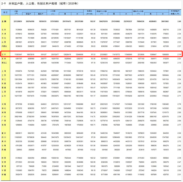 辽宁2020年城市人口总数为:25572477人,其中男性12626419人,女性12946058人,性别比(女=100)97.53