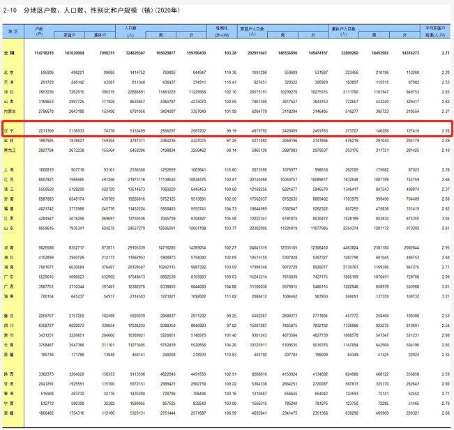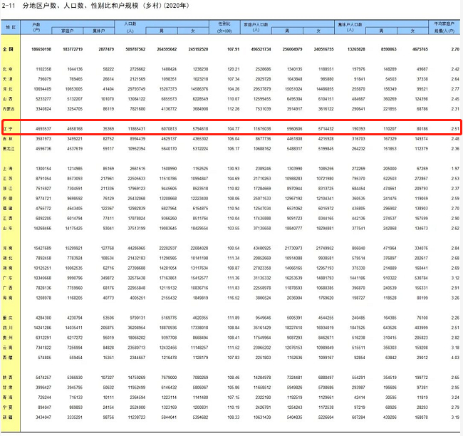 辽宁2020年乡村人口总数为:11865431人,其中男性6070813人,女性5794618,性别比(女=100)【以女性为100,男性对女性的比例】为104.77