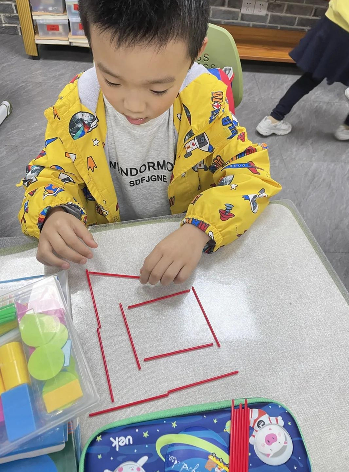 课堂上,王文莹带着学生们认识数字8和9,刚开始是数数,从一幅图片中数出数量是8和9的事物。为了加深学生们对数字8和数字9的认识,提高学生们的学习兴趣,王文莹让学生用8根小棒和9根小棒分别摆出一个自己喜欢的图形。