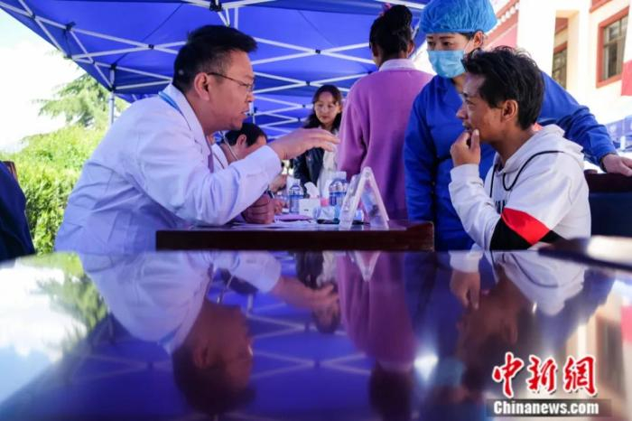 2019年5月,“同心·共铸中国心”2019走进西藏大型公益活动在拉萨启动。300余名来自北京医疗机构的医务志愿者和社会爱心人士分为6个团队,分赴拉萨、日喀则、林芝等地为当地民众开展义诊巡诊、先心病筛查、公益捐赠等系列健康帮扶活动。图为医务志愿者在拉萨市阜康医院义诊。中新社记者 何蓬磊 摄
