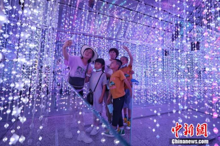 2021年10月,市民在体验馆“黔灵梦幻洞境灯光秀”内自拍。当日是国庆假期,位于贵阳市黔灵山公园外的贵阳人防科普教育体验馆吸引市民前来参观游览。中新社记者 瞿宏伦 摄