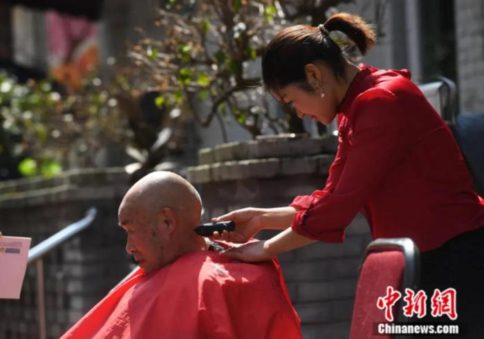 2021年3月13日,农历二月二“龙抬头”前夕,重庆爱心志愿者在美心养老院内为老人们免费理发。中新社记者 陈超 摄