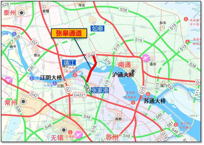 张靖皋长江大桥位于江阴大桥下游约28公里处,沪苏通长江公铁大桥上游约16公里处,起点接如皋市沪陕高速,经靖江市民主沙,于张皋汽渡西侧登陆进入张家港,终点接张家港疏港高速,路线全长约29.8公里,分跨江大桥、北接线、南接线三部分,设4座互通立交、1座服务区、1处管理分中心、1处养护工点。