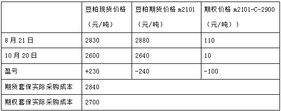 如果在8月马上采购现货,企业除了没有足够的流动资金,也没有多余仓库存放和保管货物,但担心两个月之后豆粕价格会上涨,因此企业决定进行买入套保,相对应的豆粕期货主力m2101合约盘面价格为2880元/吨,行权价为2900的豆粕看涨期权m2101-C-2900的权利金为110元/吨。