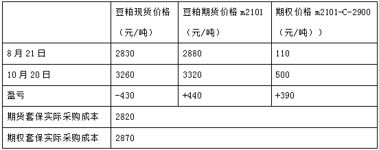 情况一:如果未来豆粕价格如期上涨,到10月20日时现货、期货、期权对应价格分别为:3260元/吨、3320元/吨、500元/吨。