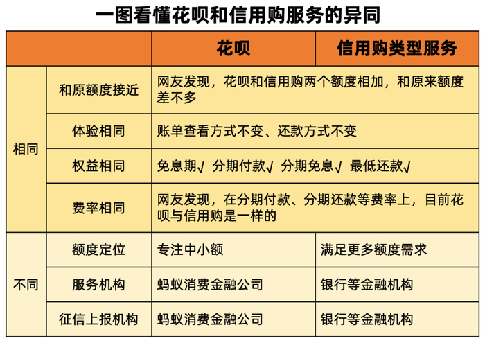 花呗大家都很熟悉,但这次“品牌隔离”是怎么回事,“信用购”类型的服务又是什么,对日常使用有什么影响?……相信有很多的疑问,小编整理了一张表格,帮助大家快速了解: