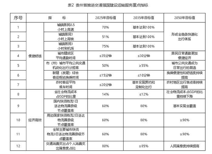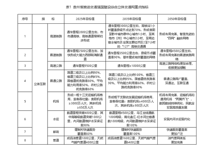 《纲要》提出,加快建设贵南、盘兴等高铁,提升贵广高铁运行时速,规划建设新渝贵、铜吉、泸遵、六威昭、都凯、水盘等高铁,研究规划贵阳至兴义至河口、兴义至百色、贵阳至铜仁至武汉、遵义至铜仁、毕节至六盘水等高速铁路。适时布局建设贵阳—贵安—安顺和遵义都市圈城际轨道交通,形成有效覆盖的城际交通网络。