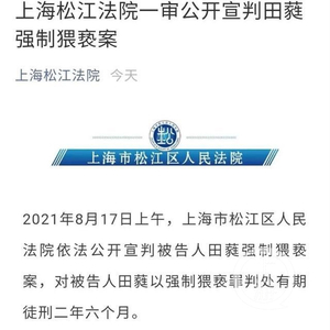 公开信息显示,2020年9月7日,上海市公安局松江分局以涉嫌强制猥亵罪将田蕤抓获,次日刑事拘留。9月22日,上海市松江区检察院对田蕤批准逮捕。同年11月19日,松江区检察院以涉嫌强制猥亵罪对田蕤提起公诉。今年8月17日上午,距离案发近1年后,上海市松江区人民法院依法公开宣判被告人田蕤强制猥亵案,对被告人田蕤以强制猥亵罪判处有期徒刑2年6个月。因为案件涉及演艺圈等情节,舆论始终对案件保持高度关注。