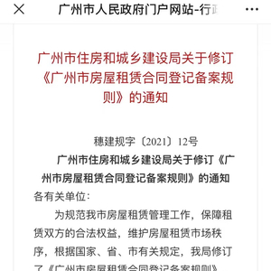 为规范房屋租赁管理工作,保障租赁双方的合法权益,维护房屋租赁市场秩序,广州市住房和城乡建设局修订了《广州市房屋租赁合同登记备案规则》(以下简称《规则》)。《规则》实施日期从2021年12月1日起,有效期5年。