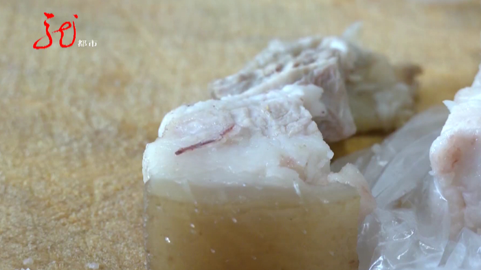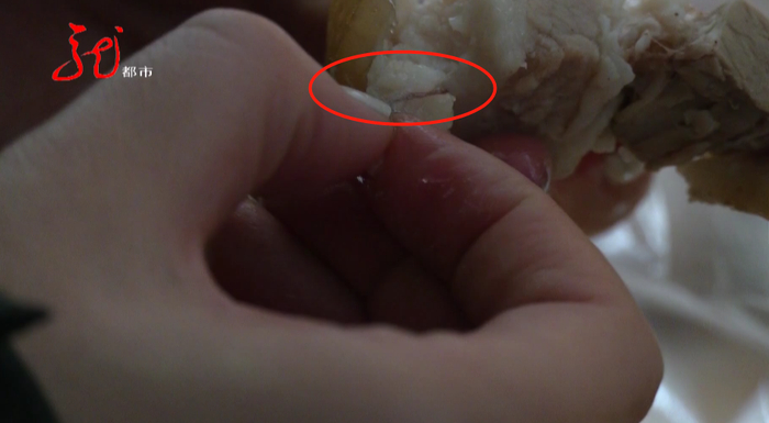 十块钱一斤,两斤多二十多块钱,回来洗的时候,我就发现那个肉,白的那个部分,靠近肉皮的那个地方,白的上面有那个红点,我当时也没注意,也没当回事就洗了,然后就煮上了。