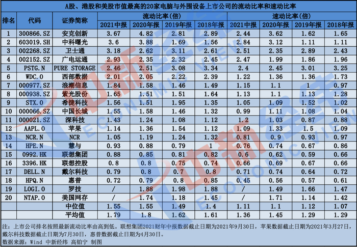 对比行业,中新经纬仍以A股、港股和美股市值最高的20家电脑与外围设备上市公司的财务数据为例,这20家企业2021年上半年的流动比率中位值、平均值分别为1.55倍、1.79倍,均明显高于联想集团的0.88倍;上述20家企业2021年上半年的速动比率中位值、平均值分别为1.11倍、1.36倍,明显高于联想集团的0.6倍。