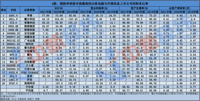 而从行业看,中新经纬选取A股、港股和美股市值最高的20家电脑与外围设备上市公司进行比较,由于部分公司2021年三季报尚未披露,故截取了2021年上半年的财务数据。Wind数据显示,这20家公司2021年上半年的资产负债率中位值、平均值分别为68.62%、65.77%,联想集团截至6月30日的资产负债率为89.72%,明显高于行业均值。在头部企业中,惠普的负债率达109.73%,戴尔的负债率达91.89%,高于联想集团负债率。