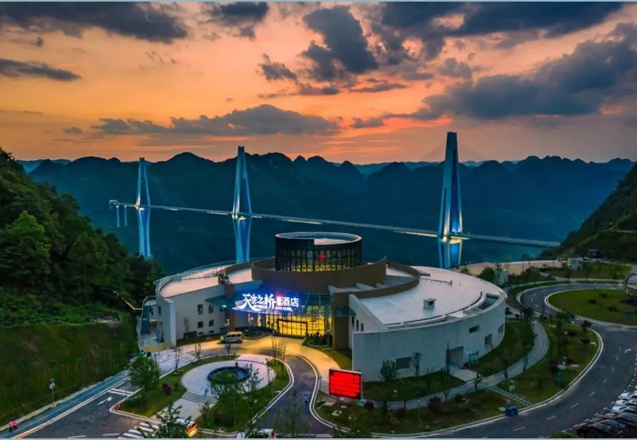 天空之桥嘉遇酒店坐落于喀斯特地貌的青山绿水间,依托世界级大桥——平塘特大桥(天空之桥),打造出贵州首个桥旅融合示范服务区项目的悬崖式精品度假酒店。