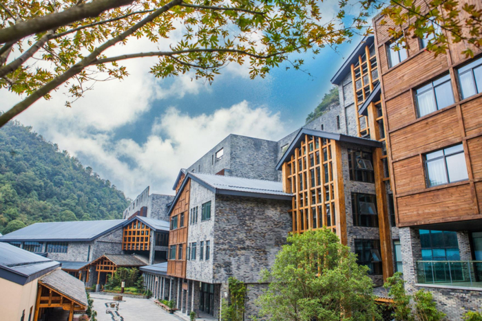 澜山酒店位于乡愁贵州景区内,以现代中式的建筑风格呈现,层叠屋顶、石墙堆砌、通透玻璃,周围植物将建筑隐于山水之间,营造出来一种古典风韵,让游客在这里真正的感受到放松和惬意。