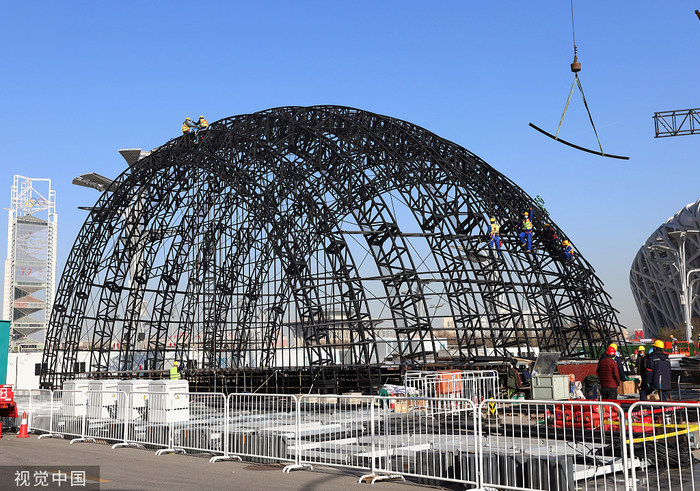 2022年冬奥会北京颁奖广场在北京国家游泳中心东侧搭建施工中,半圆弧主体钢架结构雏形初现。