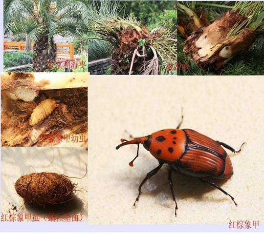 锈色棕榈象,主要危害棕榈科的加拿利海枣,2015年首次在成都市发现,目前已扩散至成都、眉山、遂宁、绵阳、乐山、南充、凉山等地。