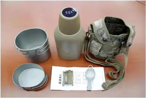 品种组成:由水壶、饭盒、菜盒、折叠勺、吊绳(含绕线器)、携行袋等六件组成。